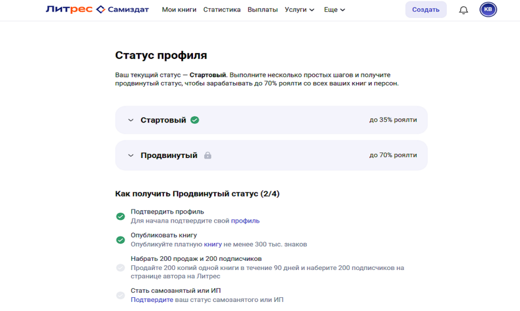 Новичок начинает с 35% от стоимости книги. Чтобы перейти на повышенный тариф — 70% — нужно выполнить одно из условий: 200 продаж, 200 подписчиков и одна книга более 300 тысяч знаков. Выплаты приходят ежемесячно, но с задержкой в два месяца (например, деньги за январь поступят в марте). Так что лучше зарание подавать заявку на вывод средств.