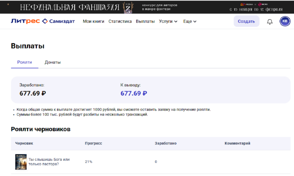 В основном выплату можно получить раз в месяц, это когда у автора наступил порог 1000 рублей. Также появились донаты в последнее время, где читатели могут без ограничения сразу на карту автору. В личном кабинете привязываете карту и появляется в вашем профиле где размещены книги — поблагодарить автора. Это очень мощный инструмент, когда много читателей и 100% без комиссии приходит.